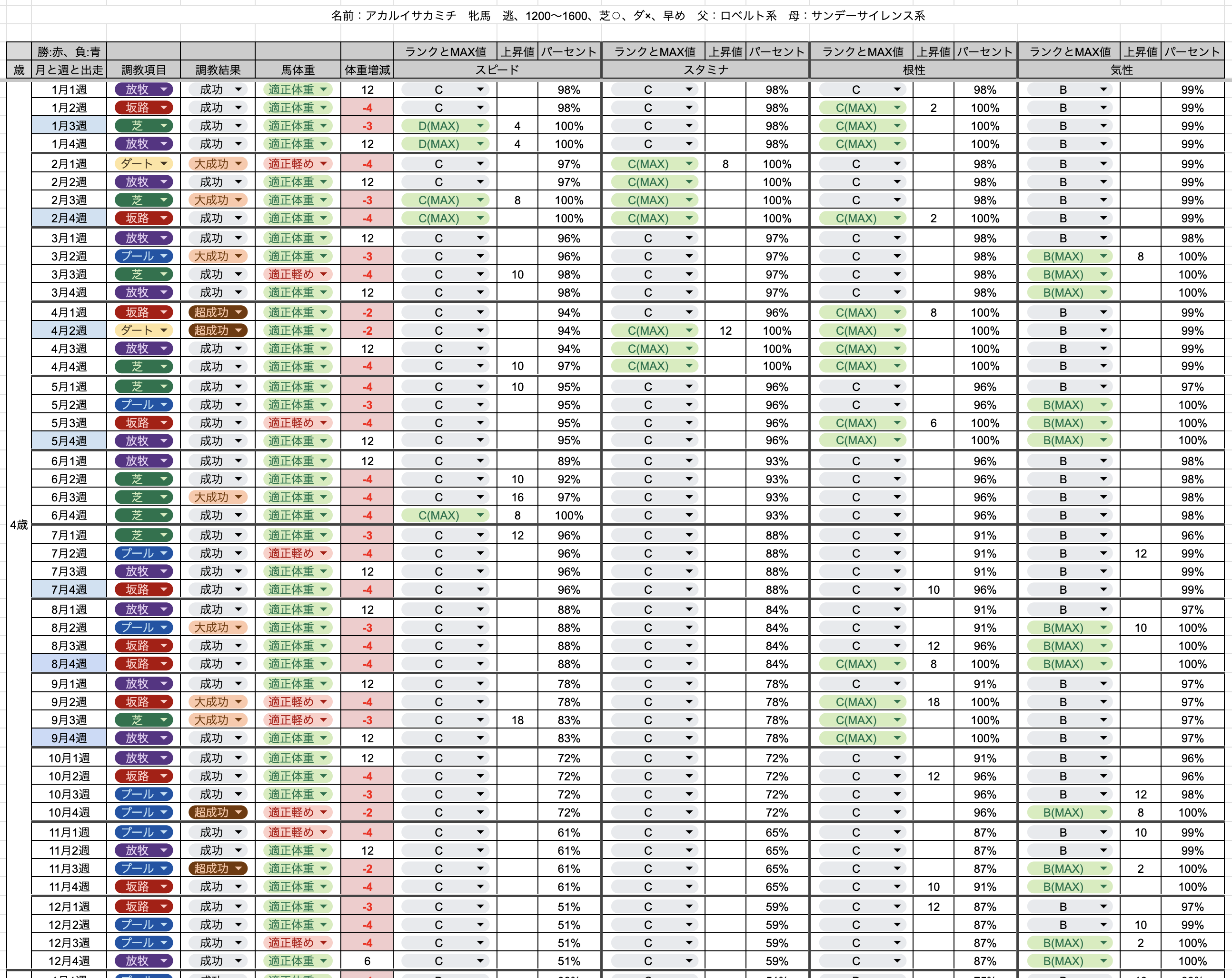- レース開催週の前週に放牧して馬体重を回復した状態で4パラメータの内の1つを実行して全てのパラメータをMAX(緑MAX)にする
