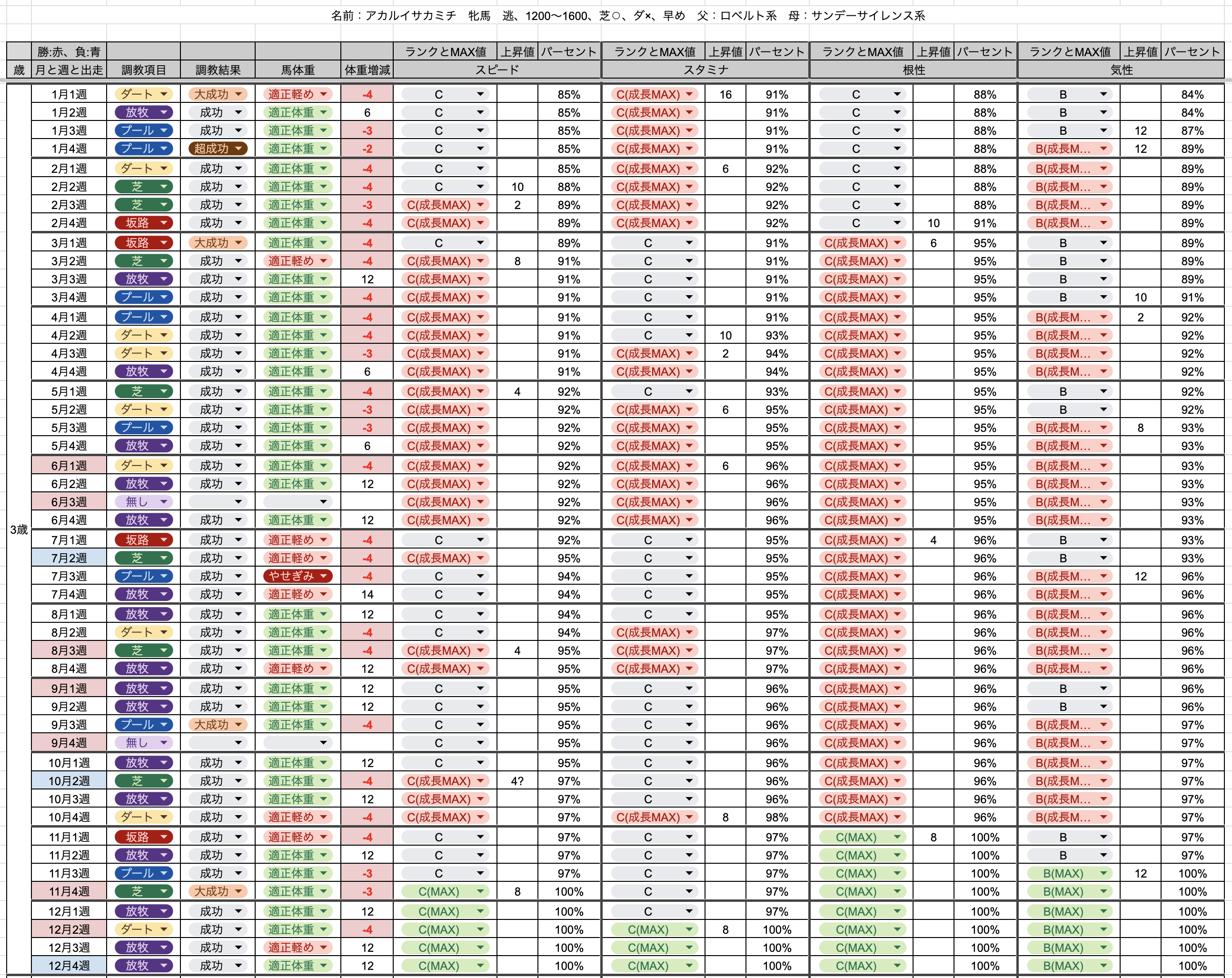 - 前週までに全てのパラメータをMAX(緑MAX)にし、レース開催週に馬体重が足りない場合は放牧し、最適体重ならそのままレースへGO!!