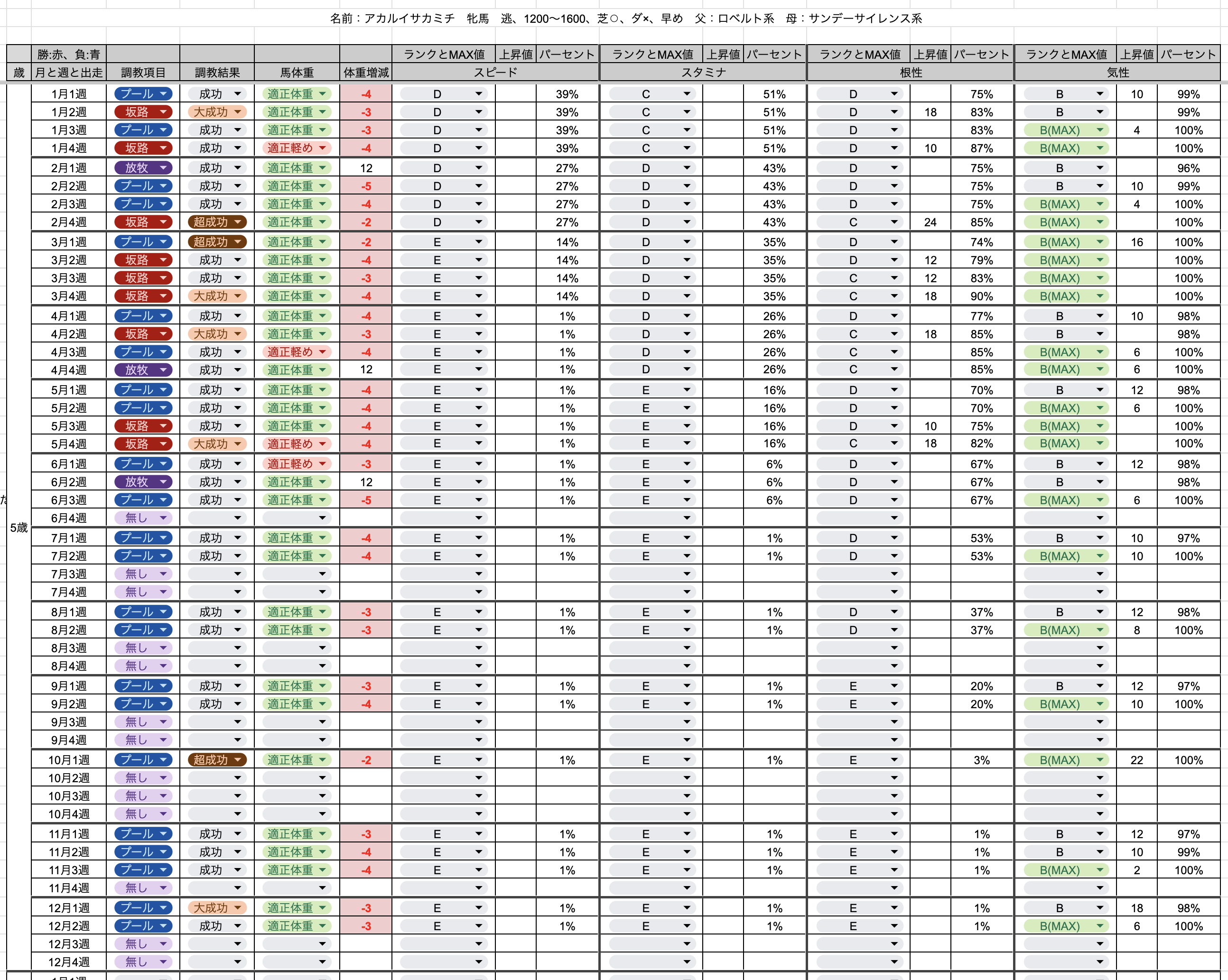 UNIVERSAL STALLION(ユニバーサルスタリオン)の攻略を進める上で、初期レース馬である「アカルイサカミチ」さんを調教する際に、どの様に能力が増減するのか知りたくなったので検証してみました。